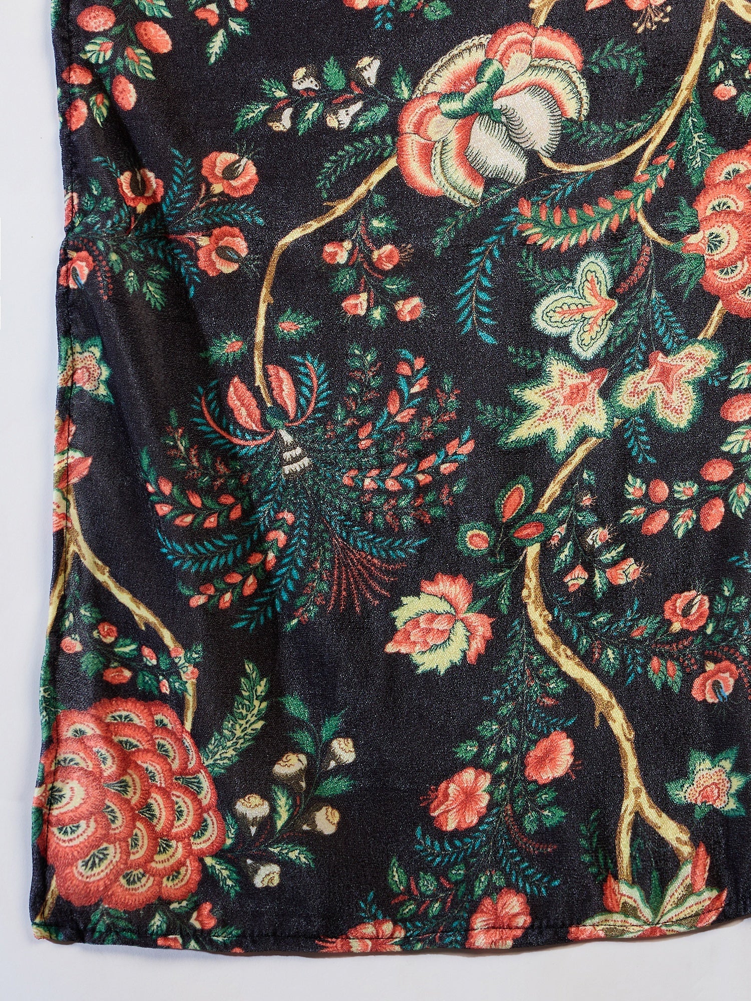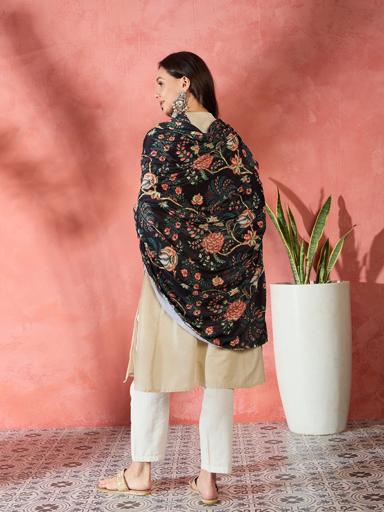 A luxurious black velvet shawl with a beautiful printed design, combining elegance and warmth. Perfect for adding a sophisticated touch to evening outfits or special occasions.