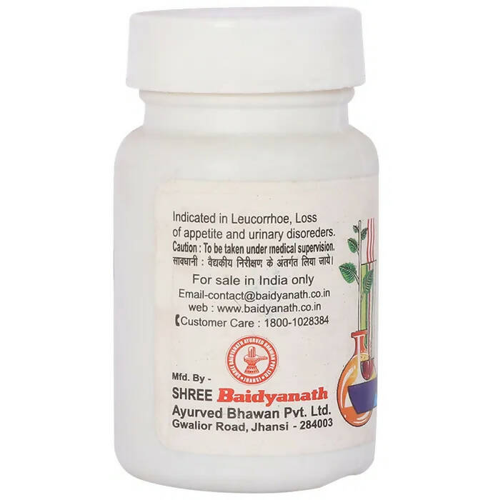 Baidyanath Jhansi Pradarantak Ras Tablets Ingredients: Kajjali Vang Bhasma Raupya Bhasma Kharpar Bhasma Kapardak Bhasma Lauha Bhasma Ghrit Kumari...
