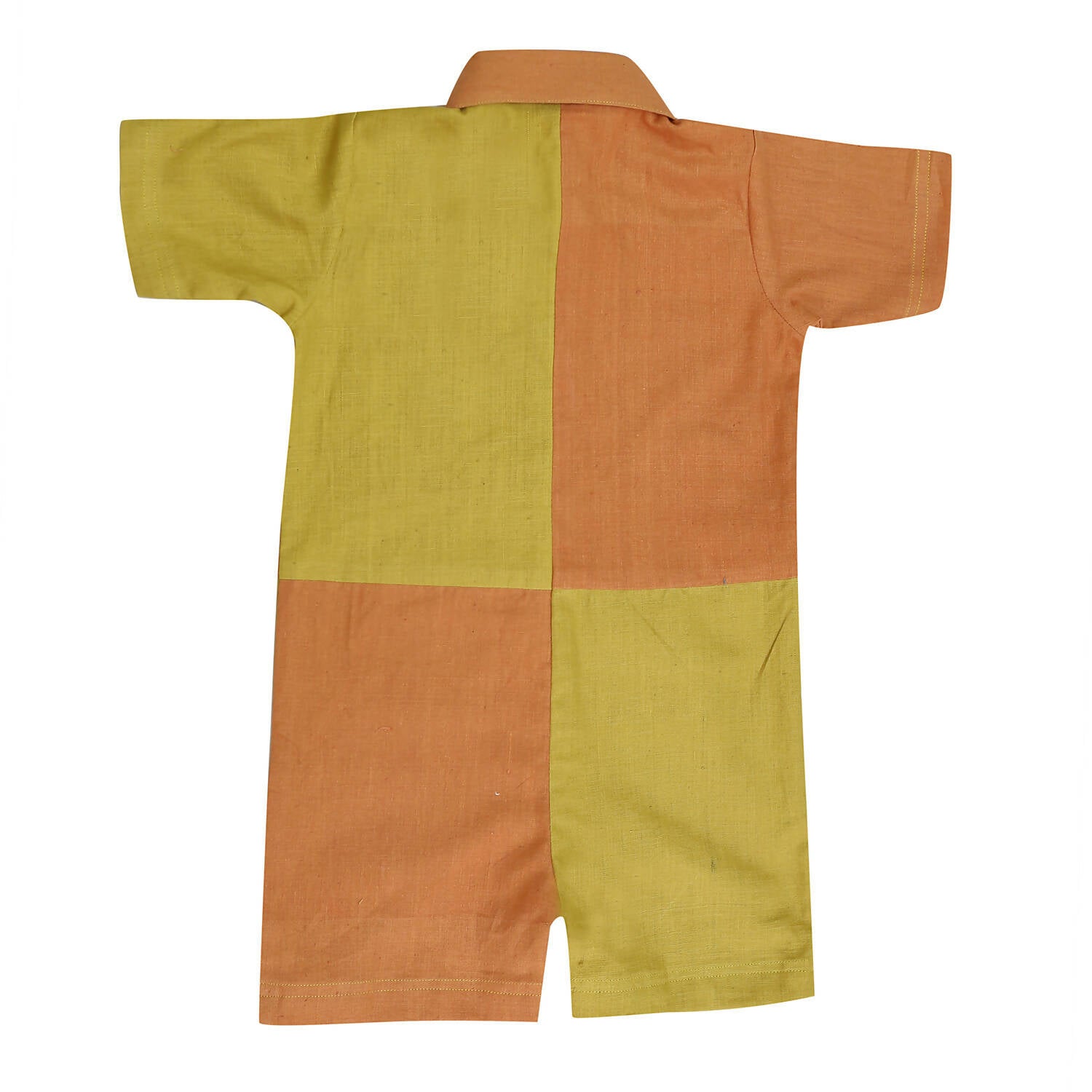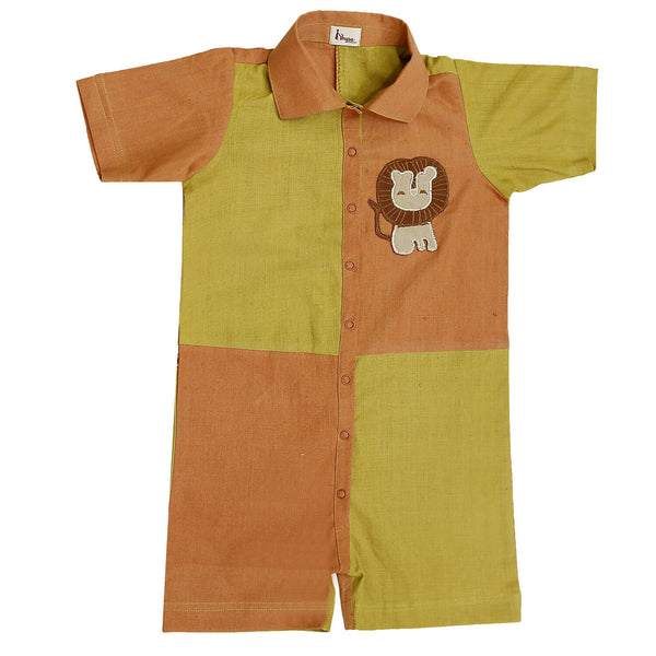 • Natural Tesu & Marigold dyed Romper features a stand collar with the front snap press on button opening and half sleeve. This classic sporty romper is made using handloom and is color-blocked using different fabrics. The lion patch adds a cute daywear attire to your kids wardrobe.