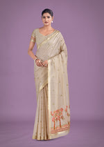 Add grace and charm for your appearance in this appealing Beige nd red Cotton silk classic saree. The ethnic Woven Butti ,Golden Zari border work to the dress adds a sign of attractiveness statement with your look. Comes with matching blouse. (Slight variation in color, fabric & work is possible. Model images are only representative.)