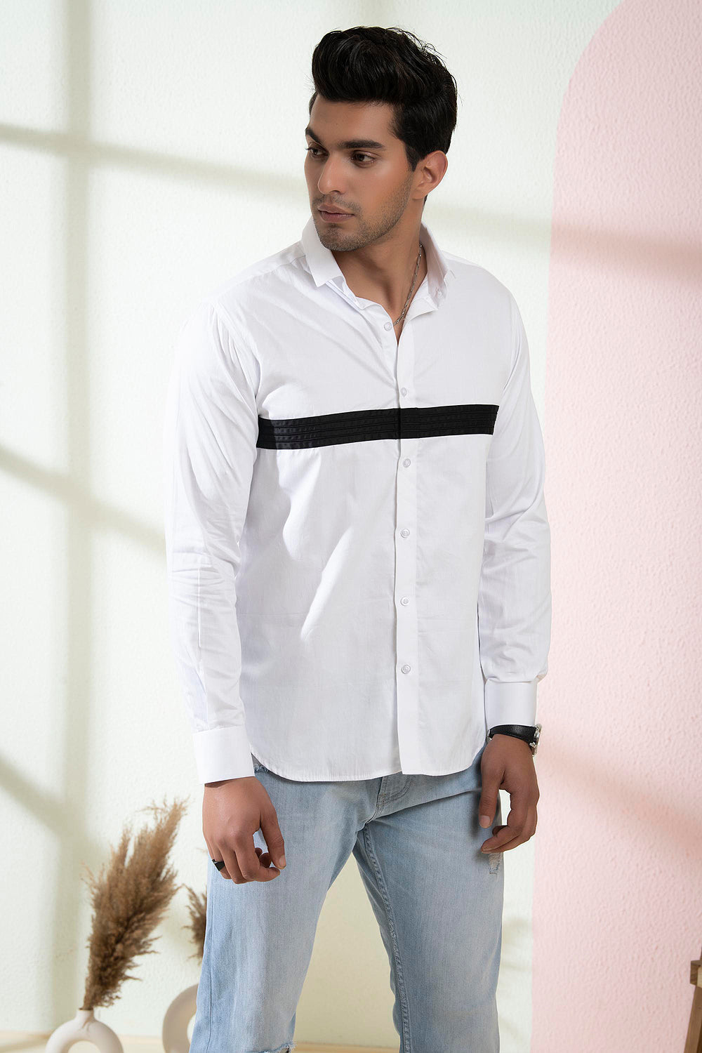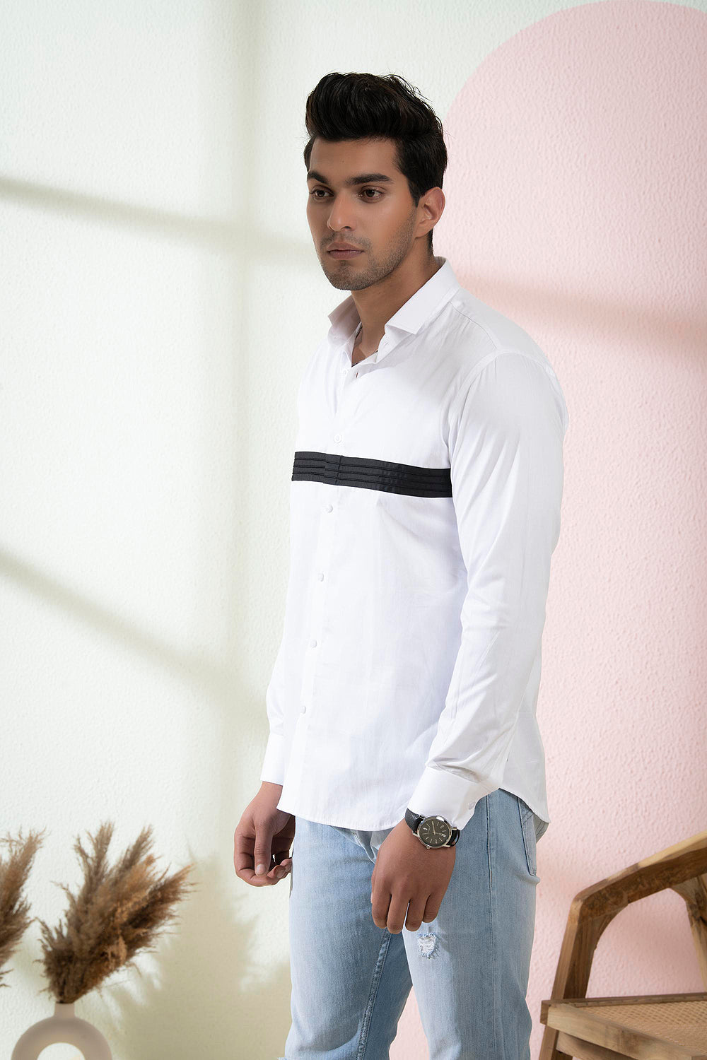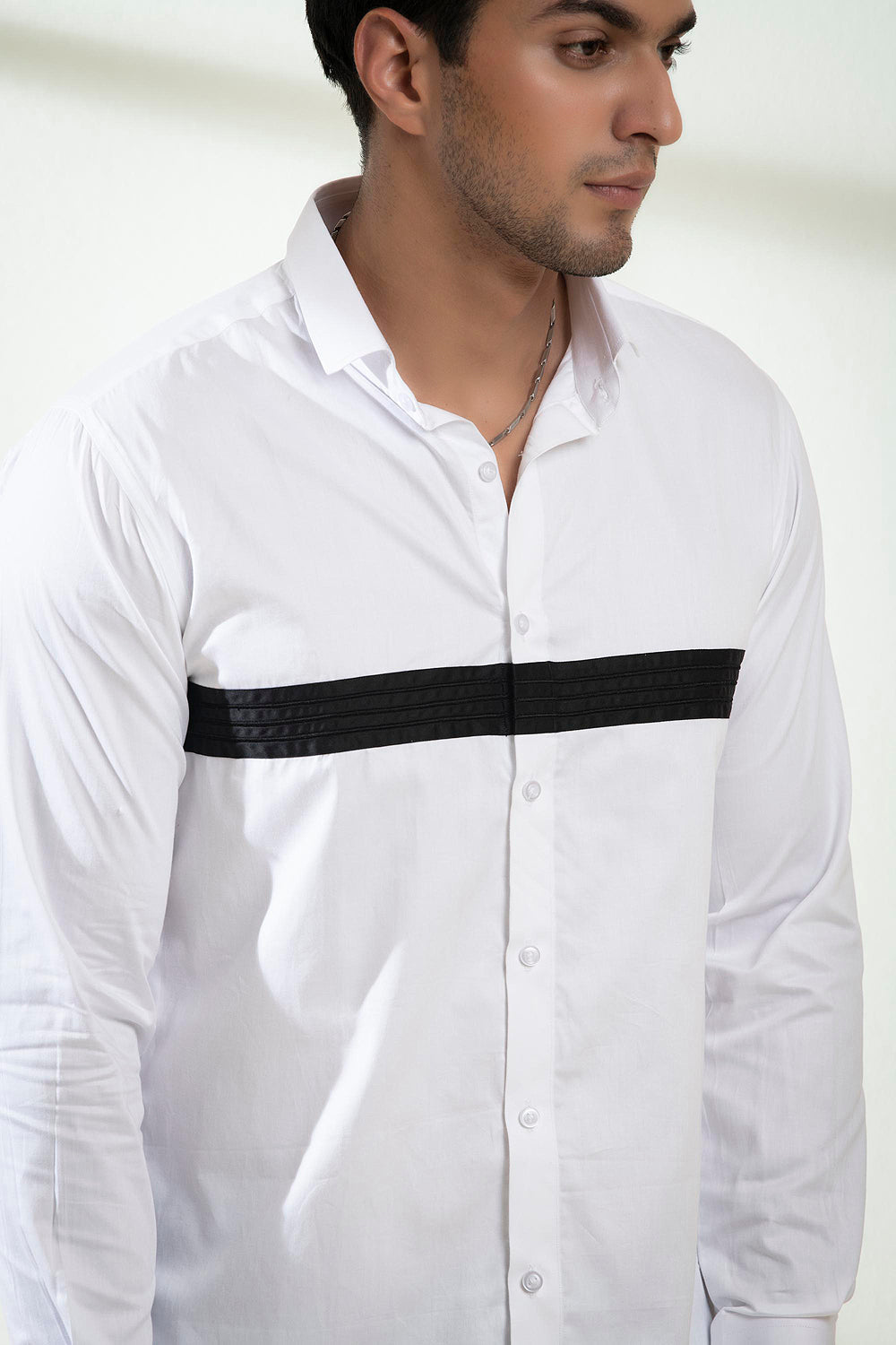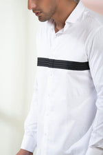 This white men's shirt features a subtle horizontal black stripe pattern on the chest, adding a touch of sophistication to your outfit. Made from soft and luxurious cotton satin, this shirt is comfortable to wear and perfect for any formal occasion. The crisp white color and sleek stripe pattern make it versatile and easy to pair with a variety of suits, pants, and ties. Upgrade your wardrobe with this stylish and classic shirt.