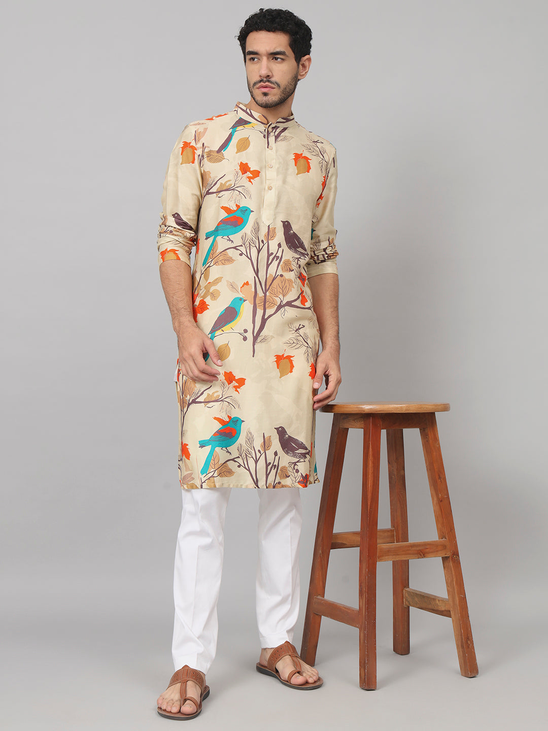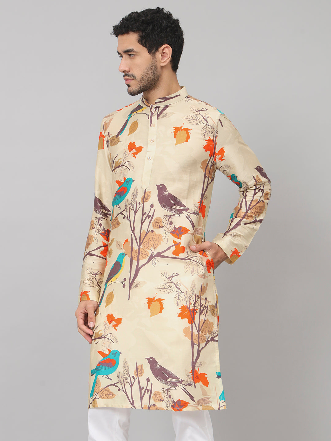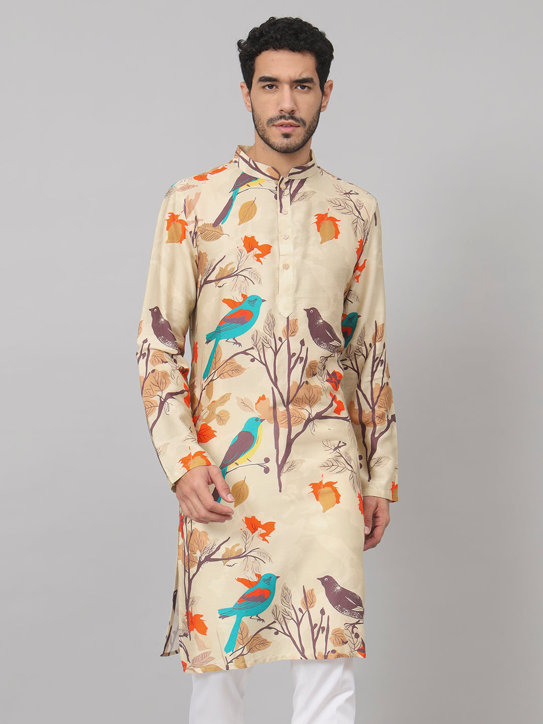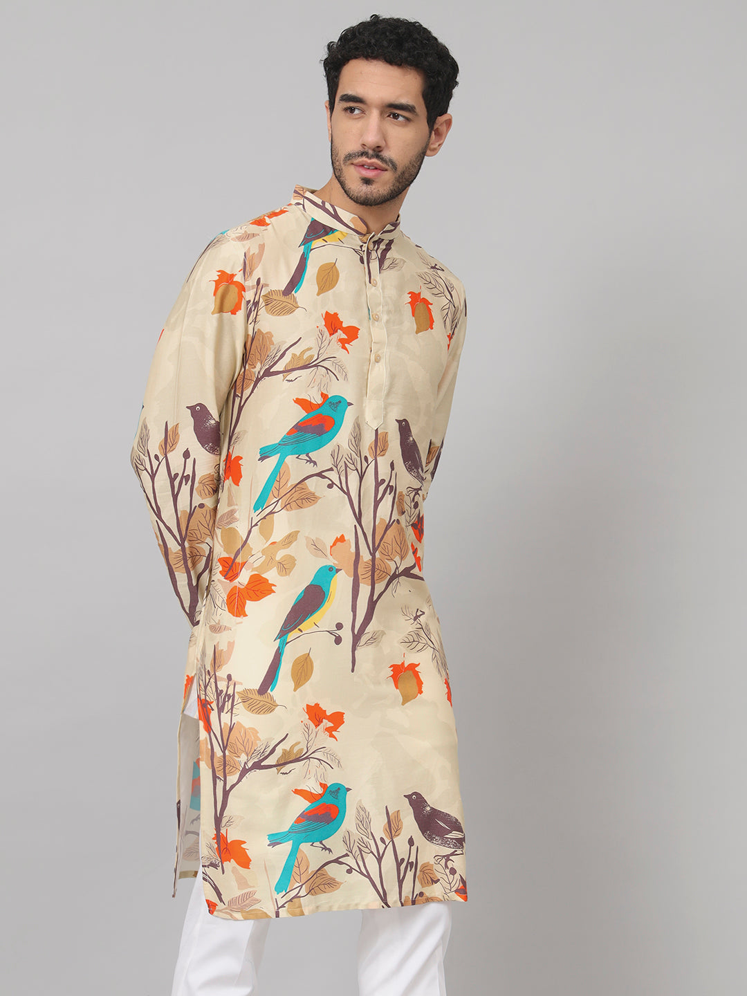 A Serenity bird-themed print cotton kurta is crafted from cotton fabric and adorned with a print design that highlights a serene or tranquil atmosphere, centered around bird-related motifs. This type of kurta typically showcases a peaceful and calming aesthetic through its design, often featuring various bird motifs, such as doves, sparrows, or other serene avian representations, printed intricately onto the cotton fabric. The overall design aims to evoke a sense of tranquility and peace, offering a garment that embodies a serene ambiance and nature-inspired charm.