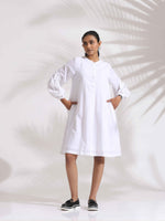 • Elevate your style with this white cotton dress which has schiffli embroidered sleeves. A pleat has been added in front for ease, it's an ideal blend of elegance and comfort.