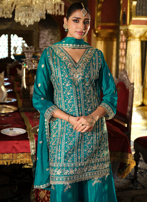 Vegaa Fashion Turquoise Chinon Silk Embroidered Designer Palazzo Suit