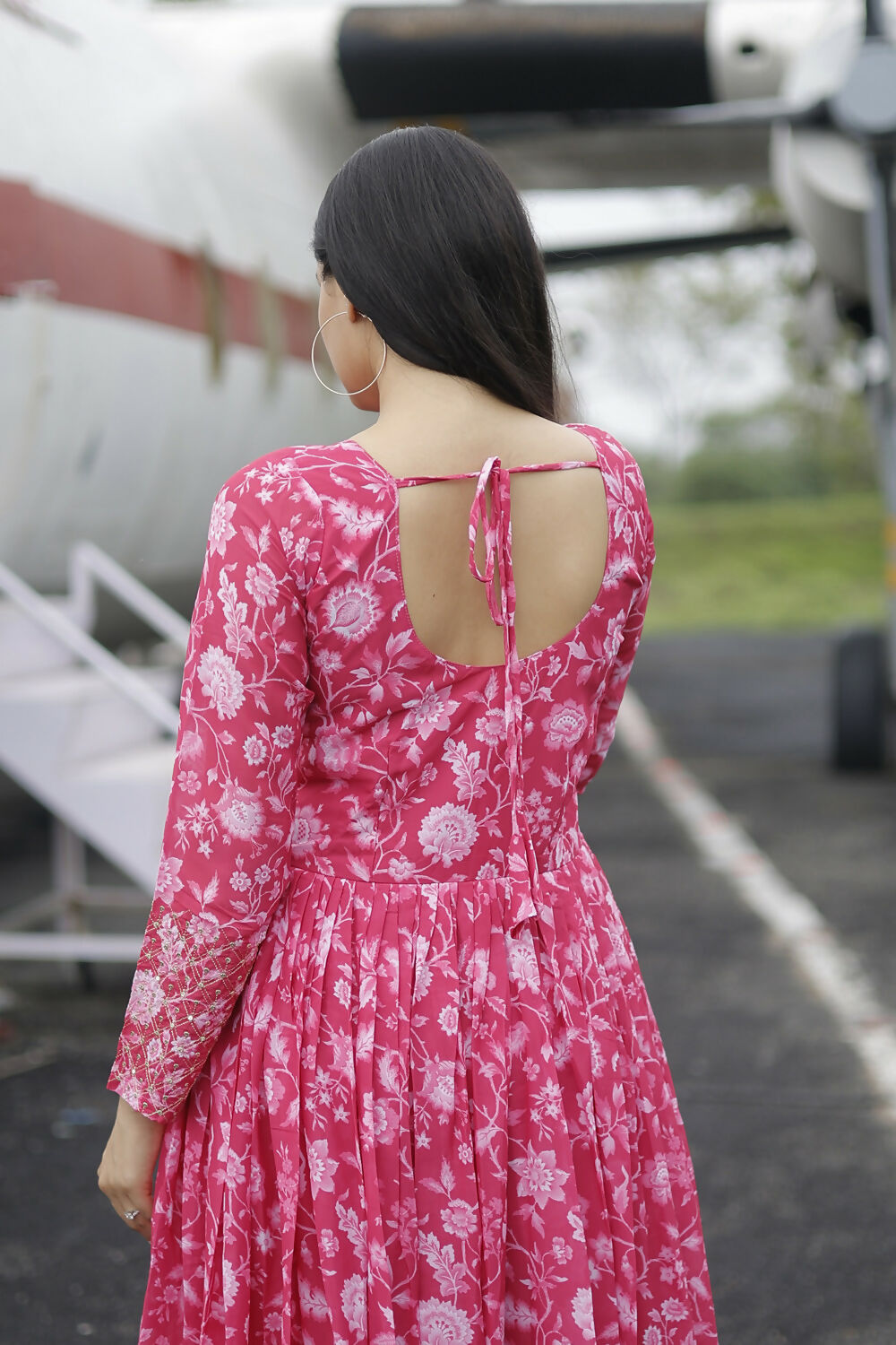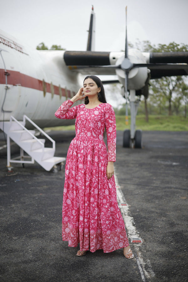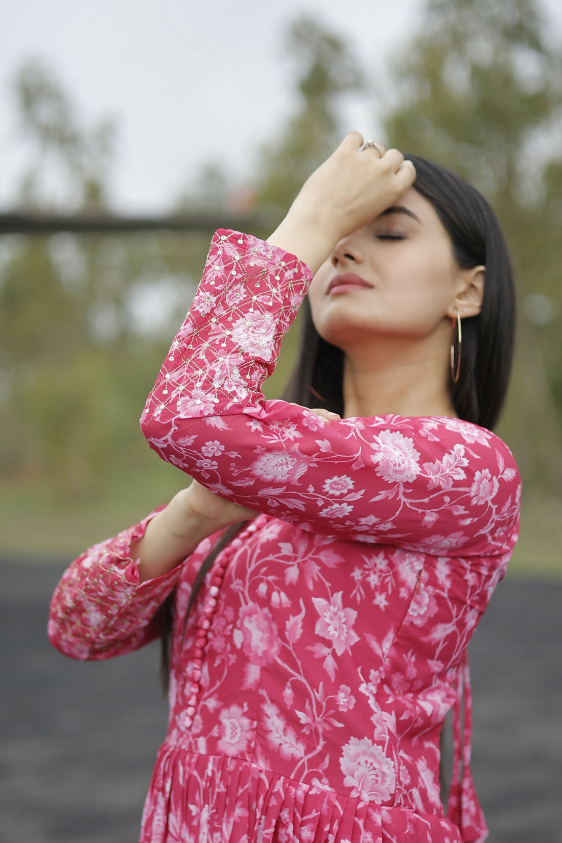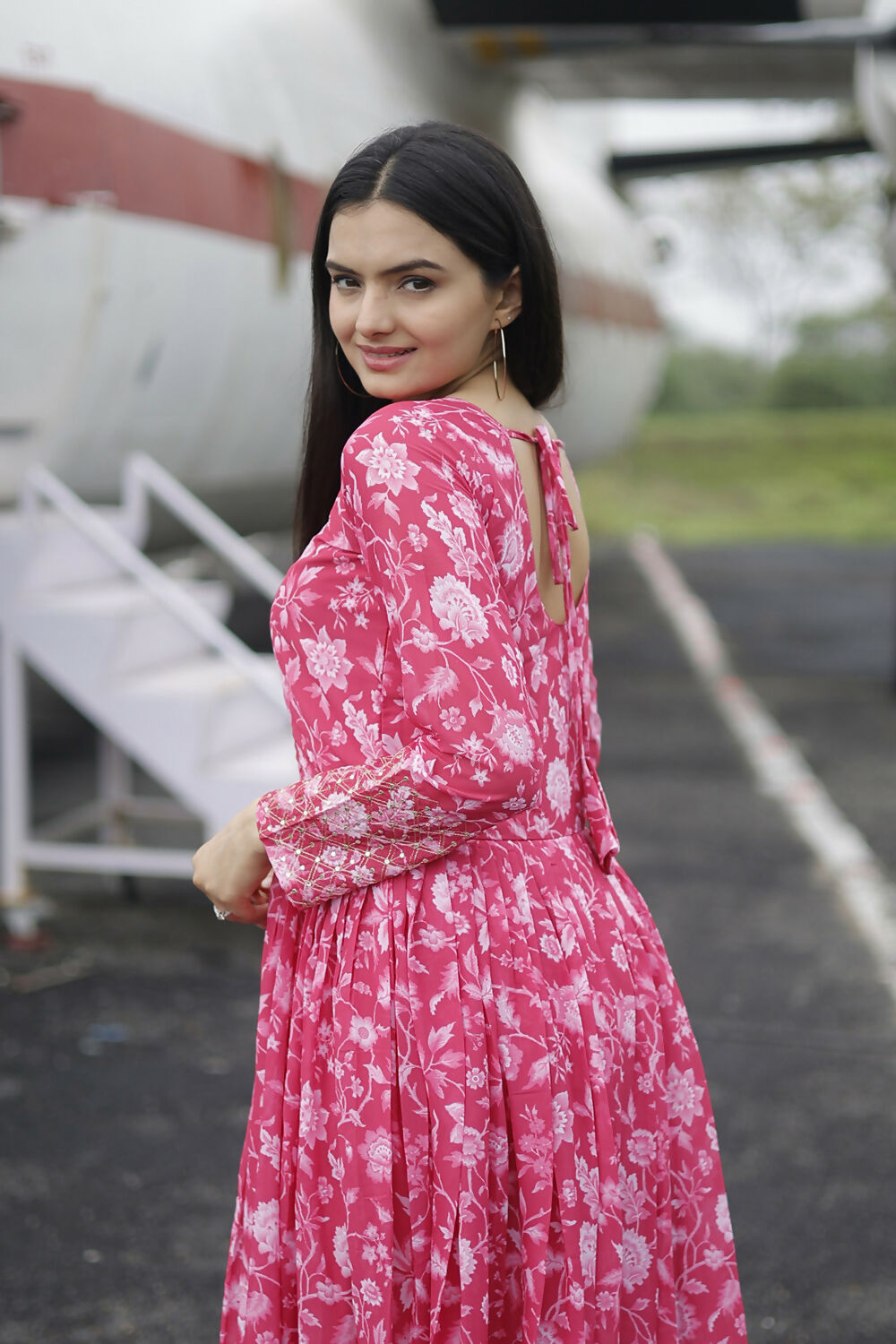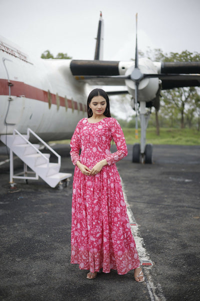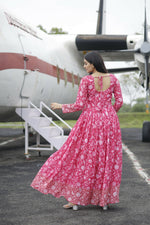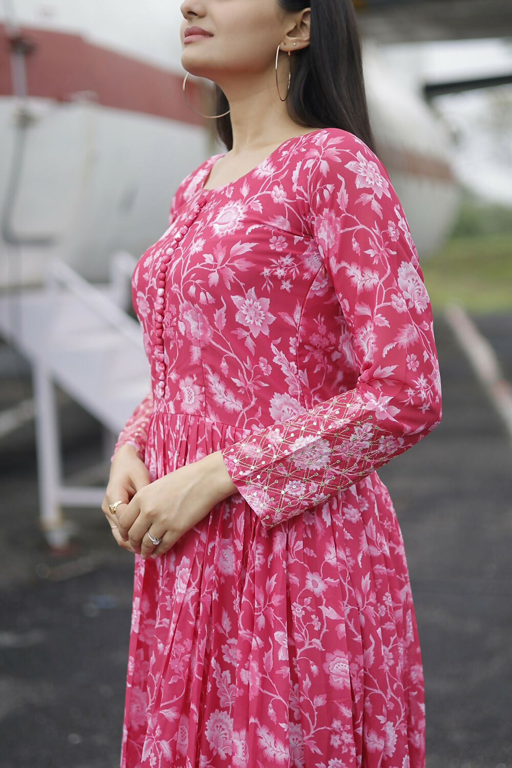 Aayaa Printed Faux Georgette with Embroidery Zari Sequins work Gown - Red Pink