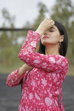 Aayaa Printed Faux Georgette with Embroidery Zari Sequins work Gown - Red Pink - M