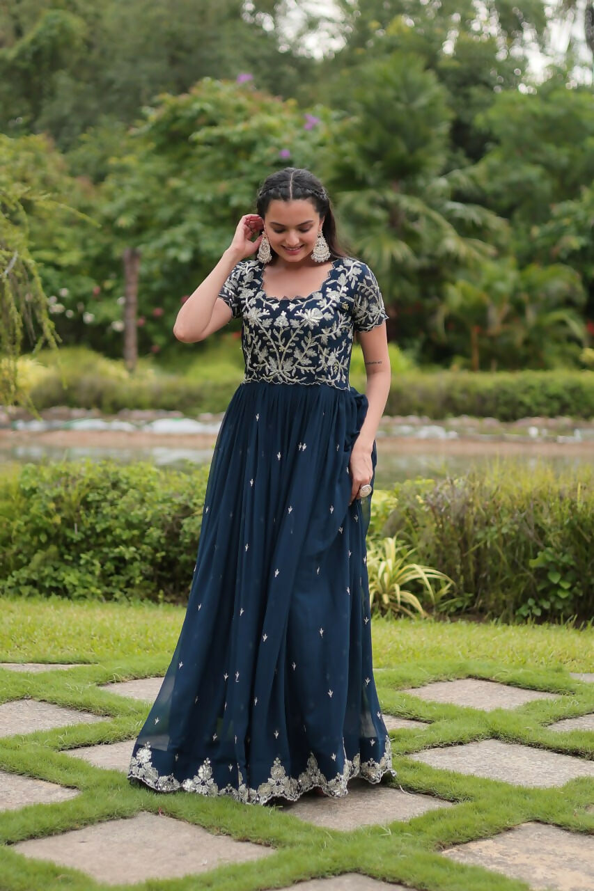 Vastranavya Premium Designer Faux Blooming with Coding Sequins Embroidery work Gown - Teal - M