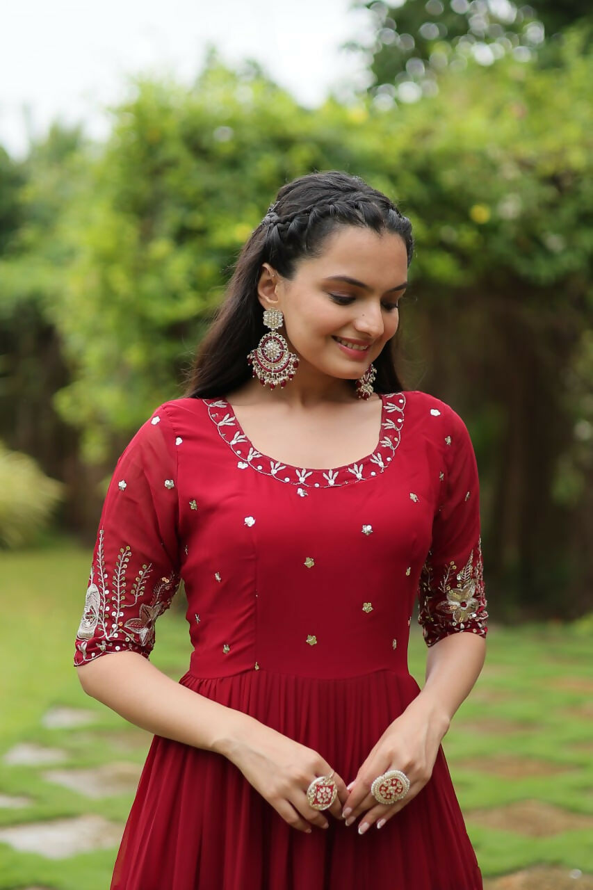 Vastranavya Premium Designer Faux Blooming with Embroidery Zari Sequins work Gown - RedDesigner Gown Is Luxury Clothing Considered To Be High Quali...