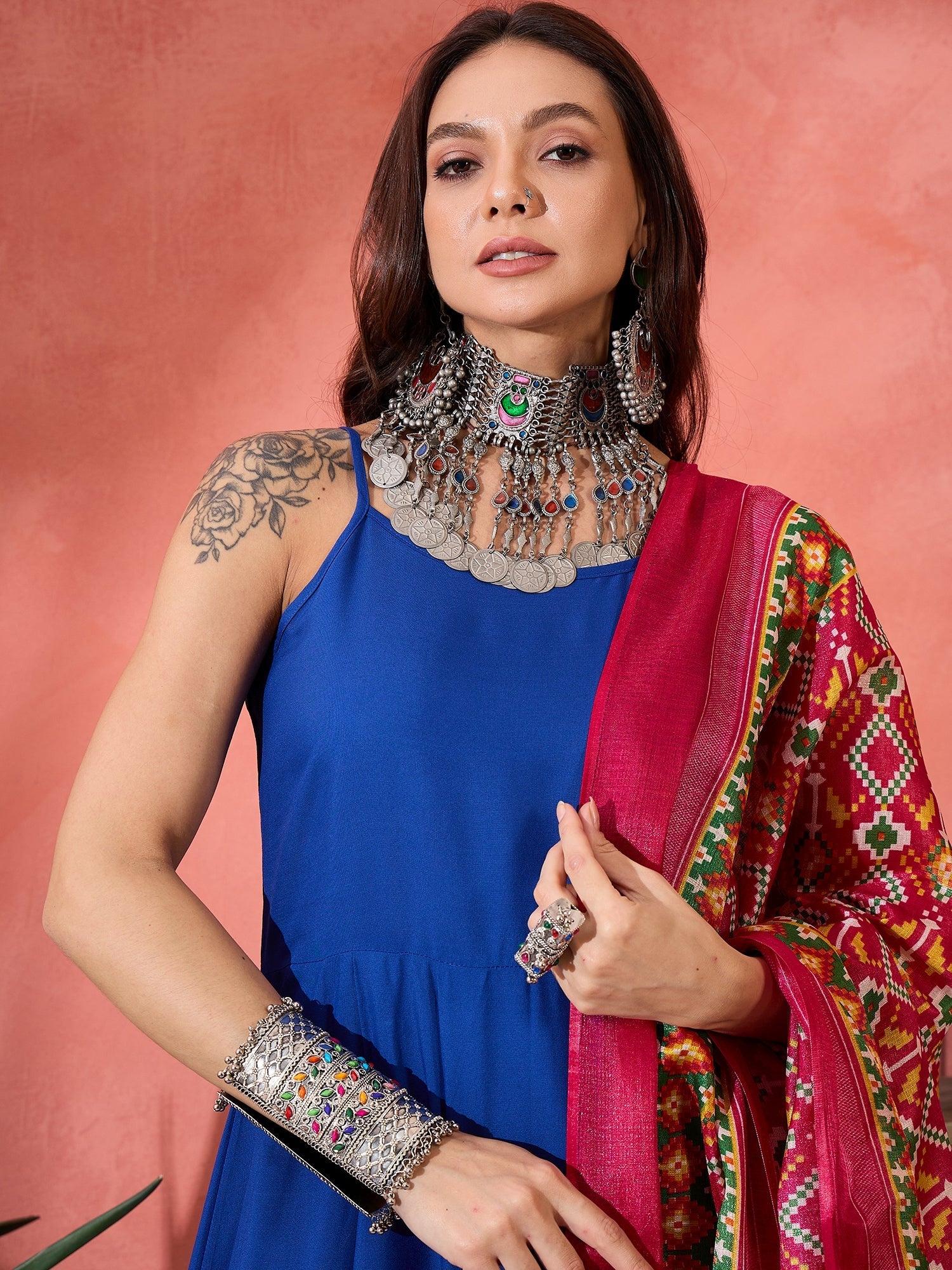 InWeave Ink Blue Strappy Kurta Set Pink Patola DupattaThe Ink Blue Strappy Kurta Set with Pink Patola Dupatta is a striking combination of rich ton...