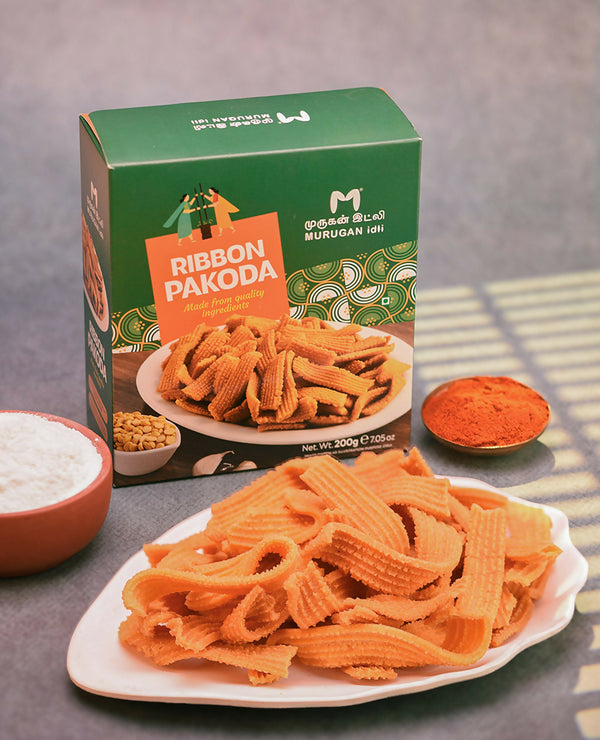 Murugan Idli Ribbon Pakoda is a ribbon-shaped South Indian snack prepared using rice flour and gram flour, blended with spices such as cumin, asafoetida, and chili powder. The dough is deep-fried to create its signature texture and distinctive appearance. It can be enjoyed on its own or served alongside hot beverages.