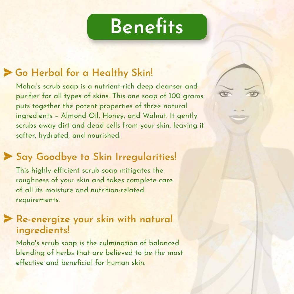 Moha Scrub Soap 100 gm: (Pack of 1), (Pack of 2)From washing away dead skin cells to hydrating your face and making it look squeaky clean and heal...
