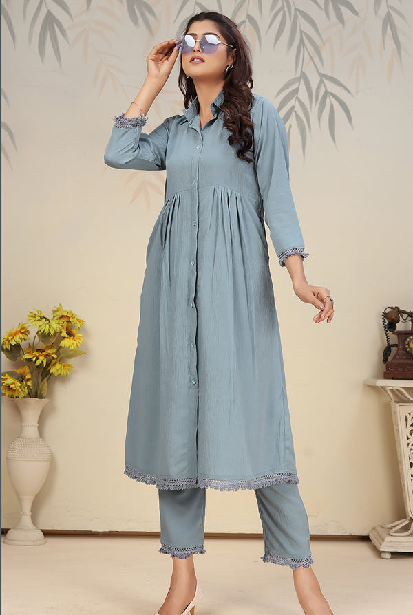 Monjolika Fashion Sky Blue Cotton Solid Festival Casual Kurti