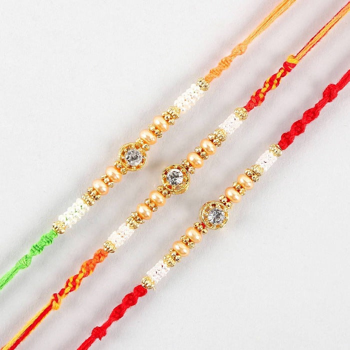Set of 3 Pearl Rakhi & Dry Fruits Jars Combo:Product Details: Designer Pearl Rakhi- Set of 3 These designer rakhis showcases pearl detailing fo...