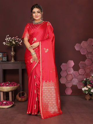 Joban Fashion Red Floral Banarasi Silk Sarees