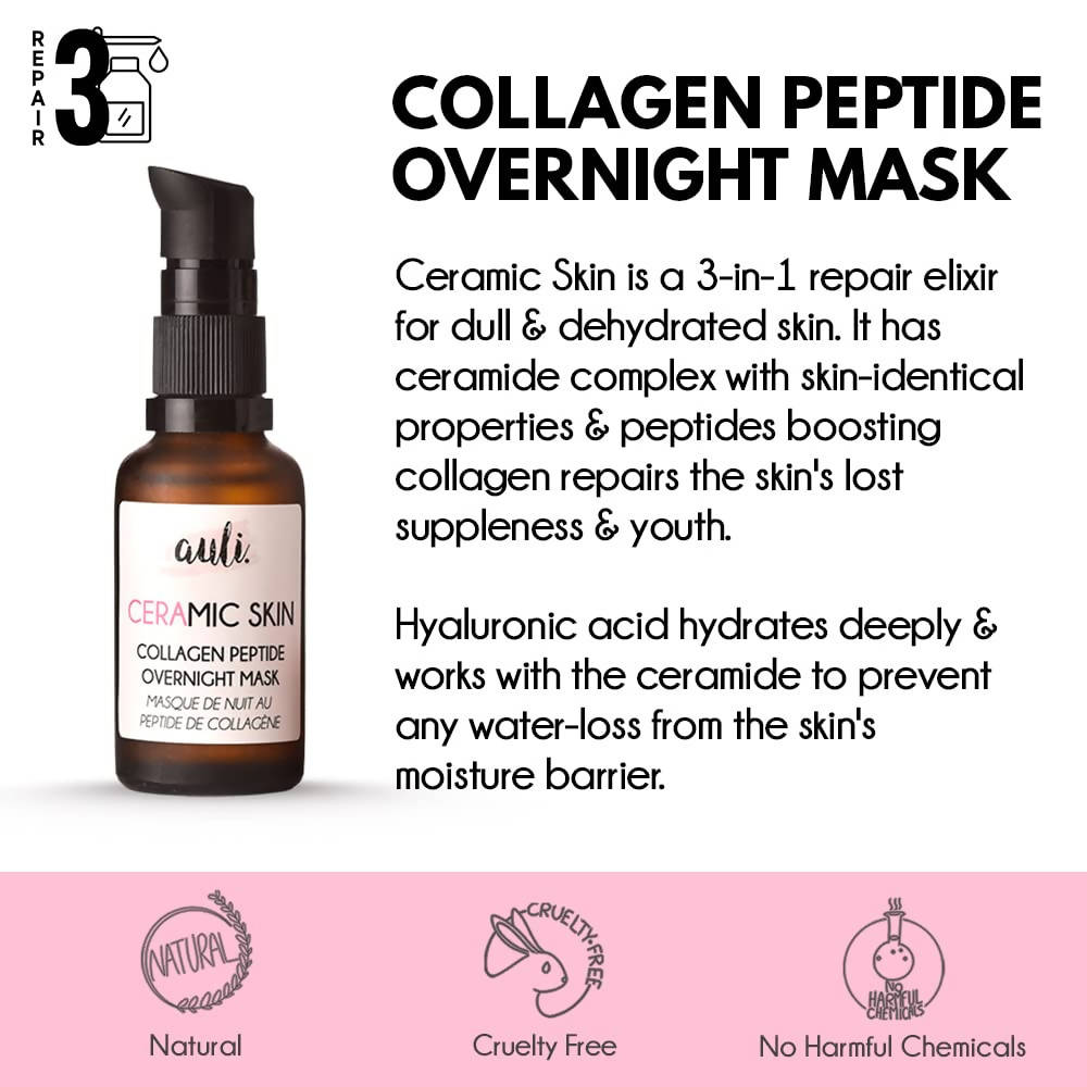 Ceramic Skin by Auli is an overnight collagen facial serum, that functions as a 3-in-1 repair elixir for dull and dehydrated skin. It has a ceramide complex with skin-identical properties and peptides boosting collagen, that repairs the skin's lost suppleness, to return its youthfulness. This is indeed the go-to collagen serum for skin tightening.