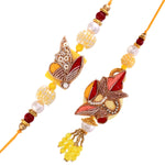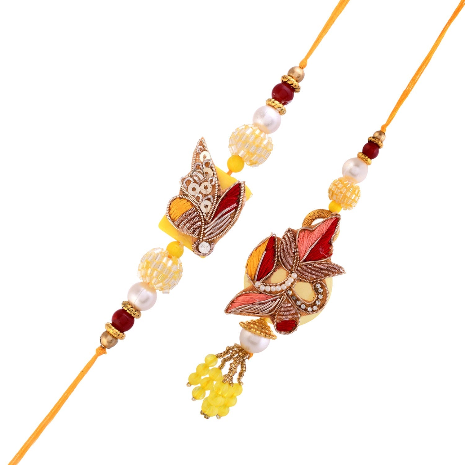 • Faux white pearls and Kundan gemstones adorn these beautiful bhaiya Bhabhi Rakhi's, which feature traditional motifs. Designed to be comfortable for all-day wear and the perfect Rakhi's to add a touch of sparkle to the special occasion of Raksha Bandhan.
