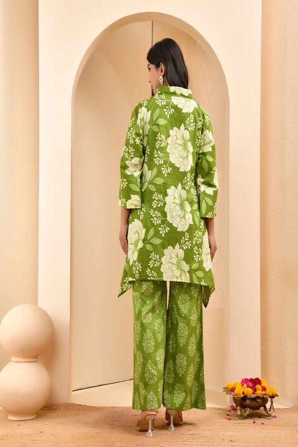 Vaasva Women Green Cotton Cord Set With Printed Pants