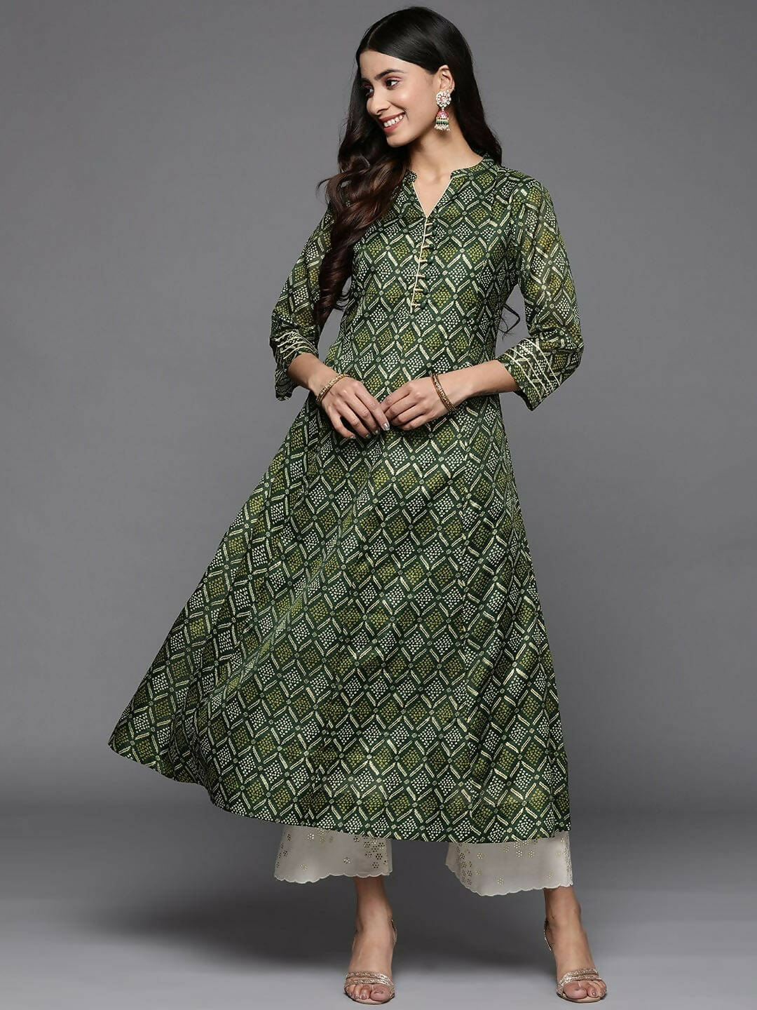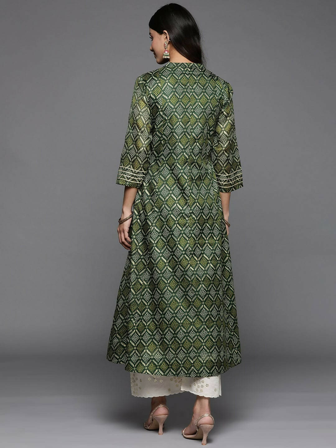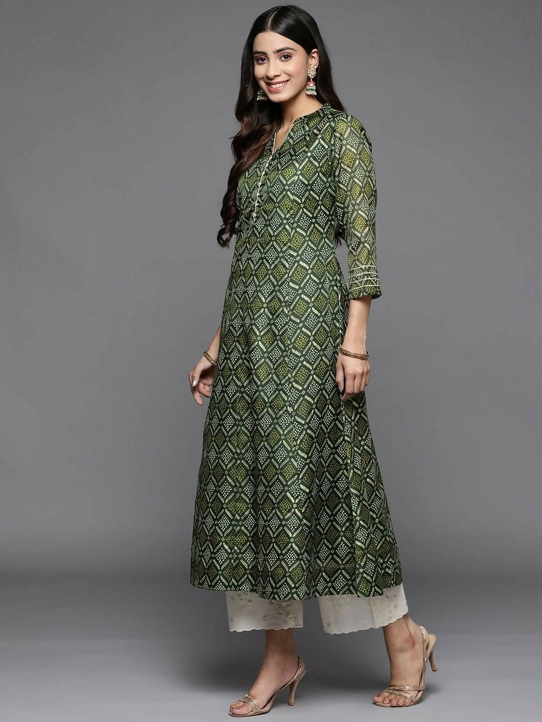 Varanga Women Green Bandhani Printed Anarkali KurtaDescription: Color: Green Neck: Mandarin Collar Sleeve Length: Three-Quarter Sleeves Sleeve Styl...