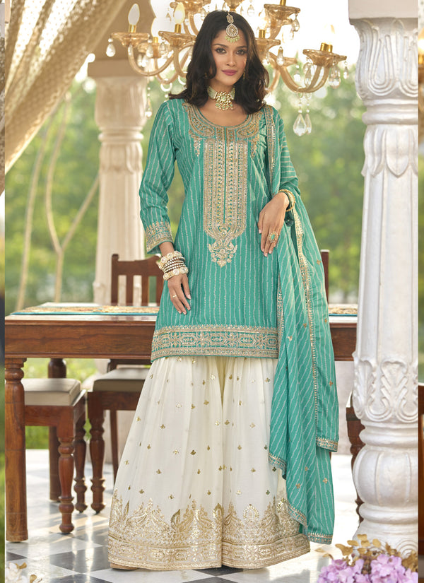Vegaa Fashion Turquoise Chinon Silk Embroidered With Digital Print Palazzo Suit