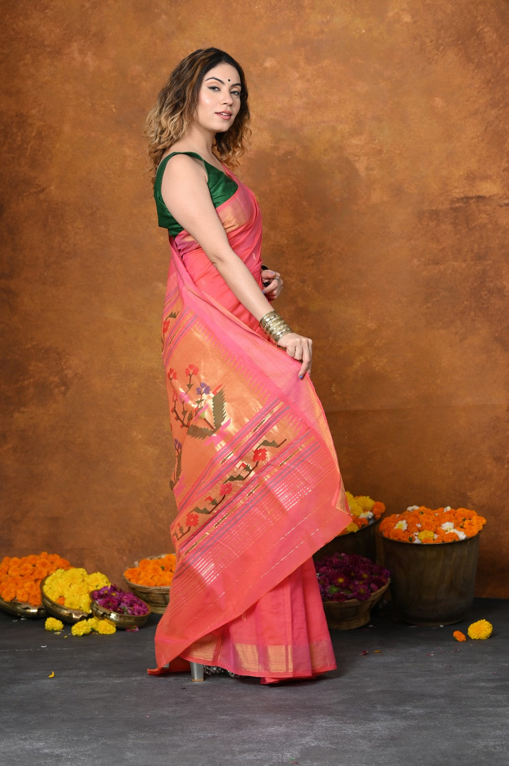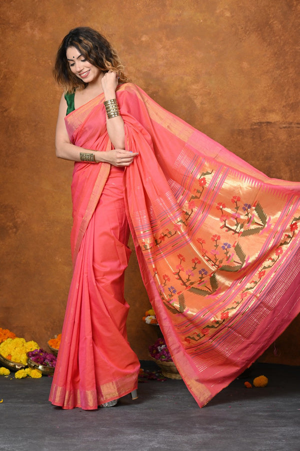 Handloom Pure Cotton Paithanis are classy and super stylish!! That gives you a break from regular sarees and makes you look elegant and royal, we would say a must have in your wardrobe and don't forget to share with us the compliments you get for this drape. Our Pure Cotton Paithani sarees come directly from the weavers of Maharashtra, yes we proudly support the local!!!.