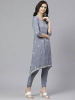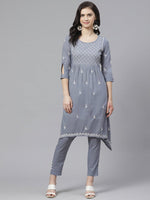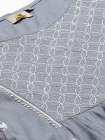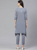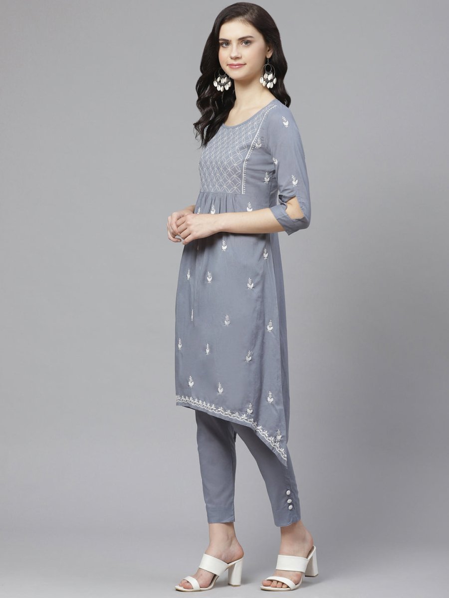 Grey and white chikankari embroidered A-line calf length kurta, has a round neck, three-quarter sleeves, asymmetric hem