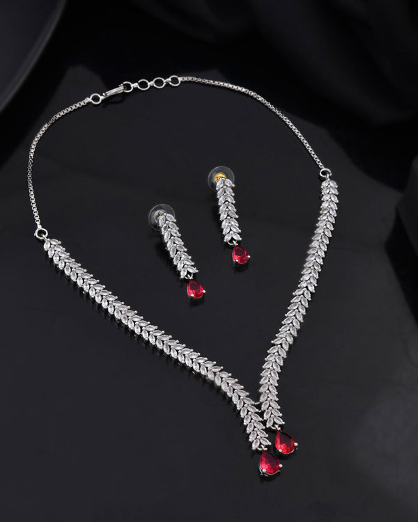 Make an unforgettable statement with the Ruby Cascade Royale Diamond-Style Necklace Set, designed for women who love timeless elegance with a touch of royal charm. This exquisite imitation jewellery set features a graceful V-shaped necklace adorned with finely cut diamond-style stones, flowing seamlessly into stunning ruby-red teardrop accents that add depth, drama, and sophistication. Crafted with a premium silver-tone finish, the necklace sits beautifully on the neckline, enhancing both traditional and contemporary outfits. The matching drop earrings mirror the necklace’s brilliance, creating a perfectly coordinated look for weddings, festive celebrations, cocktail parties, and evening occasions. Lightweight yet striking, this necklace set ensures all-day comfort while delivering a bold, high-end appearance. Pair it with sarees, lehengas, gowns, or Indo-western outfits for a refined, glamorous look. An ideal choice for gifting, bridesmaids, and festive wear lovers.