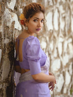 • Lavender and silver-toned banarasi saree