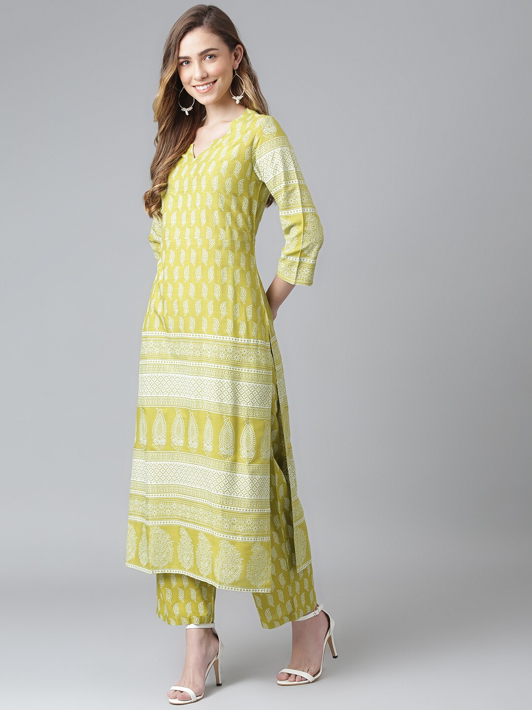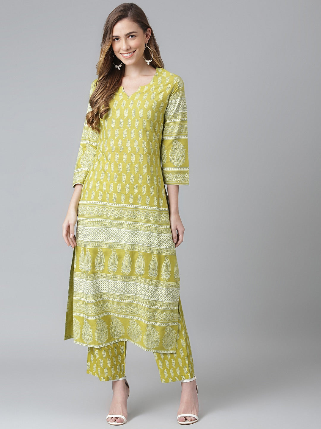 Khushal K Women Green Printed Kurta with Palazzos Product Details Green printed kurta with palazzos Green straight calf length kurta, has a roun...