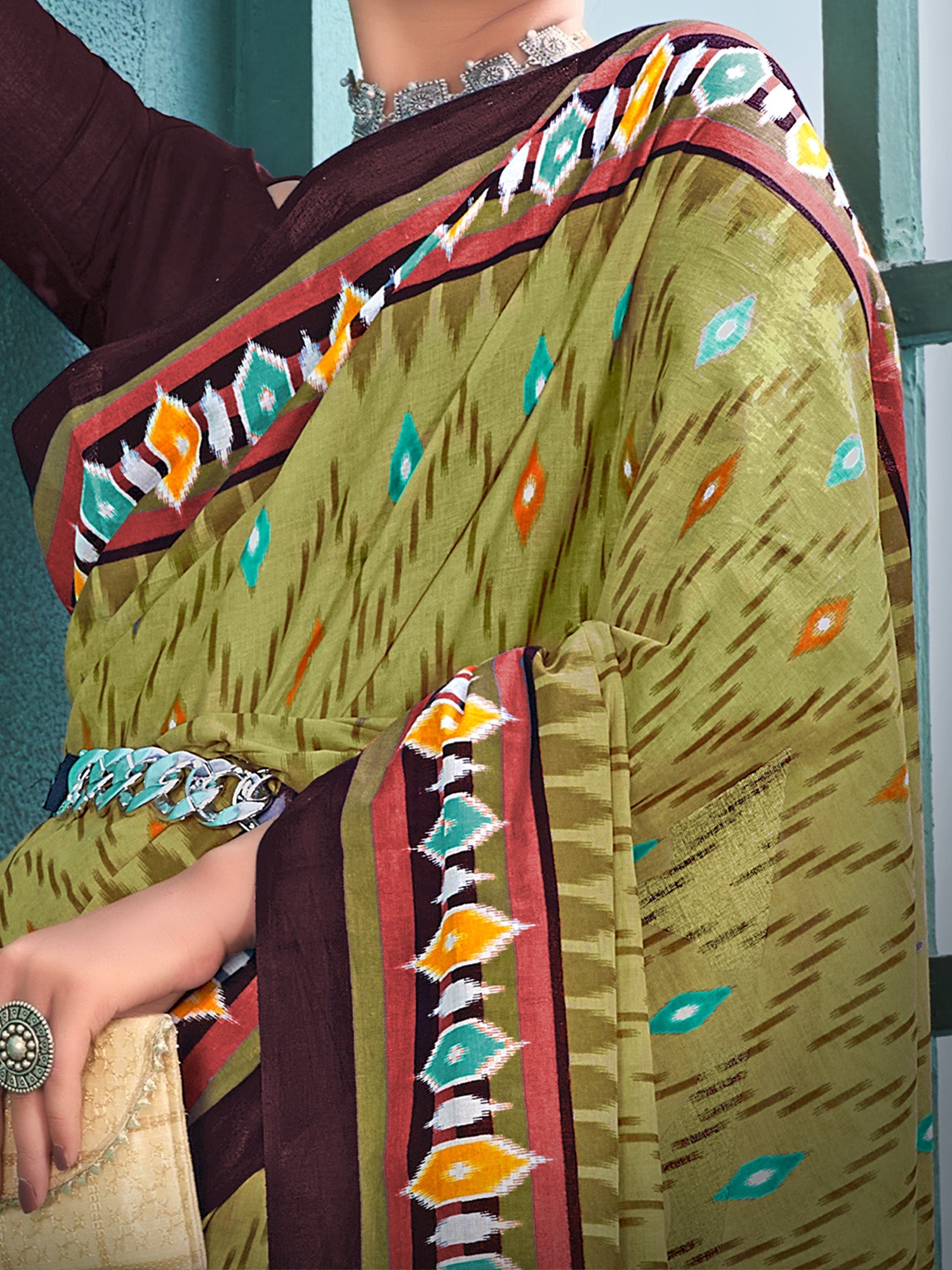 NOZ2TOZ Women's Cotton Olive Printed Designer Saree With Blouse PieceDESCRIPTION This saree is made from Cotton and is Olive in color. Our Ethnic S...