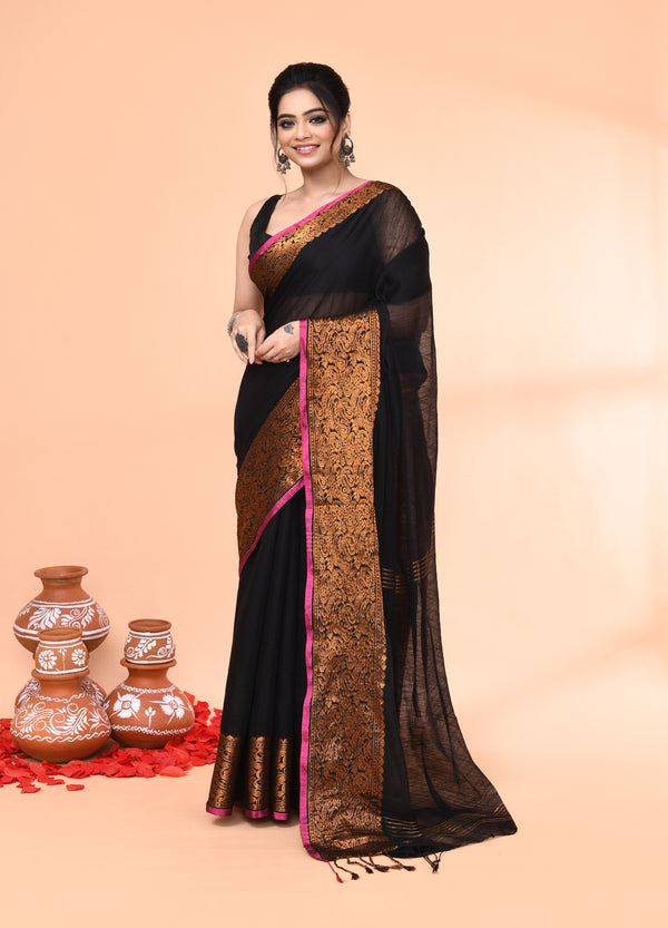 Piyari Fashion Women`s Cotton Blend Black Handloom Saree With Blouse