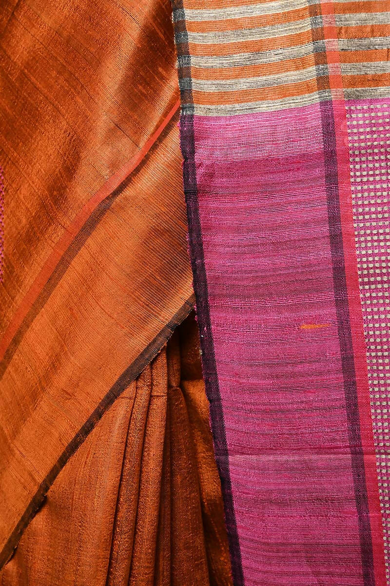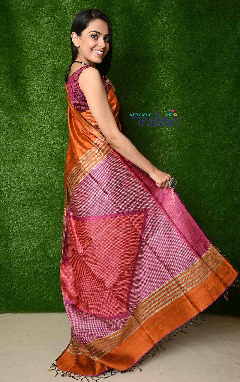Very Much Indian Handwoven Raw Silk Dupion Saree - Orange With Pink Pallu - Distacart