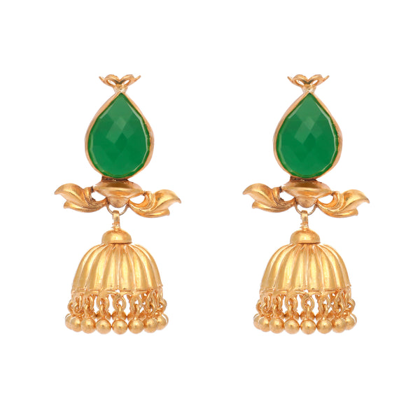 22 k Gold-toned ethnic jhumkas, gold-plated, has semi precious emerald stone with floral details. Secured with a post and back closure.