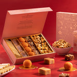 A delightful assortment of mithai, dry fruits, and namkeen, elegantly packed in a festive gift box.