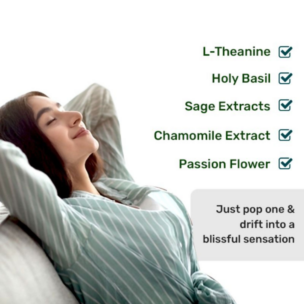 • The Goodness Inside:Passion Flower and Chamomile Extracts to deliver a calming sensation and anxiety relief; L-Theanine to relieve anxiety; Holy Basil to improve mental equilibrium; Sage to increase tranquillity.