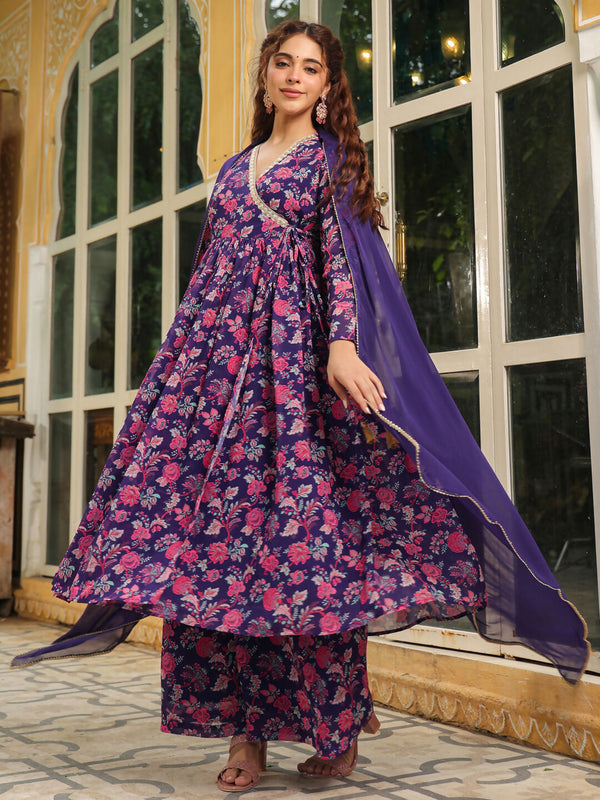 Janasya Purple Georgette Floral Kurta,Bottom & Dupatta