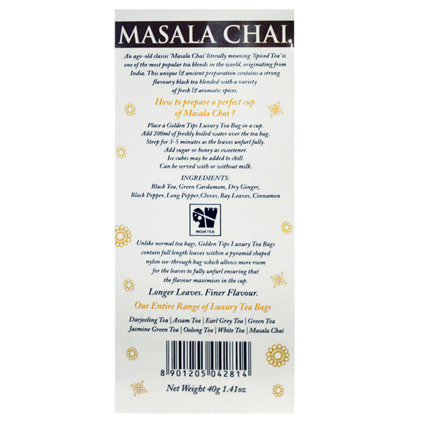 Golden Tips Masala Chai Full Leaf Pyramid Tea BagsAn age-old classic 'Masala Chai' literally meaning 'Spiced Tea' is one of the most popular tea bl...