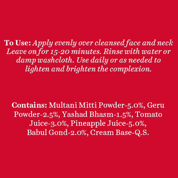 Apply evenly over cleansed face and neck Leave on for 15-20 minutes. Rinse with water or damp washcloth. Use daily or as needed to lighten and brighten the complexion