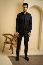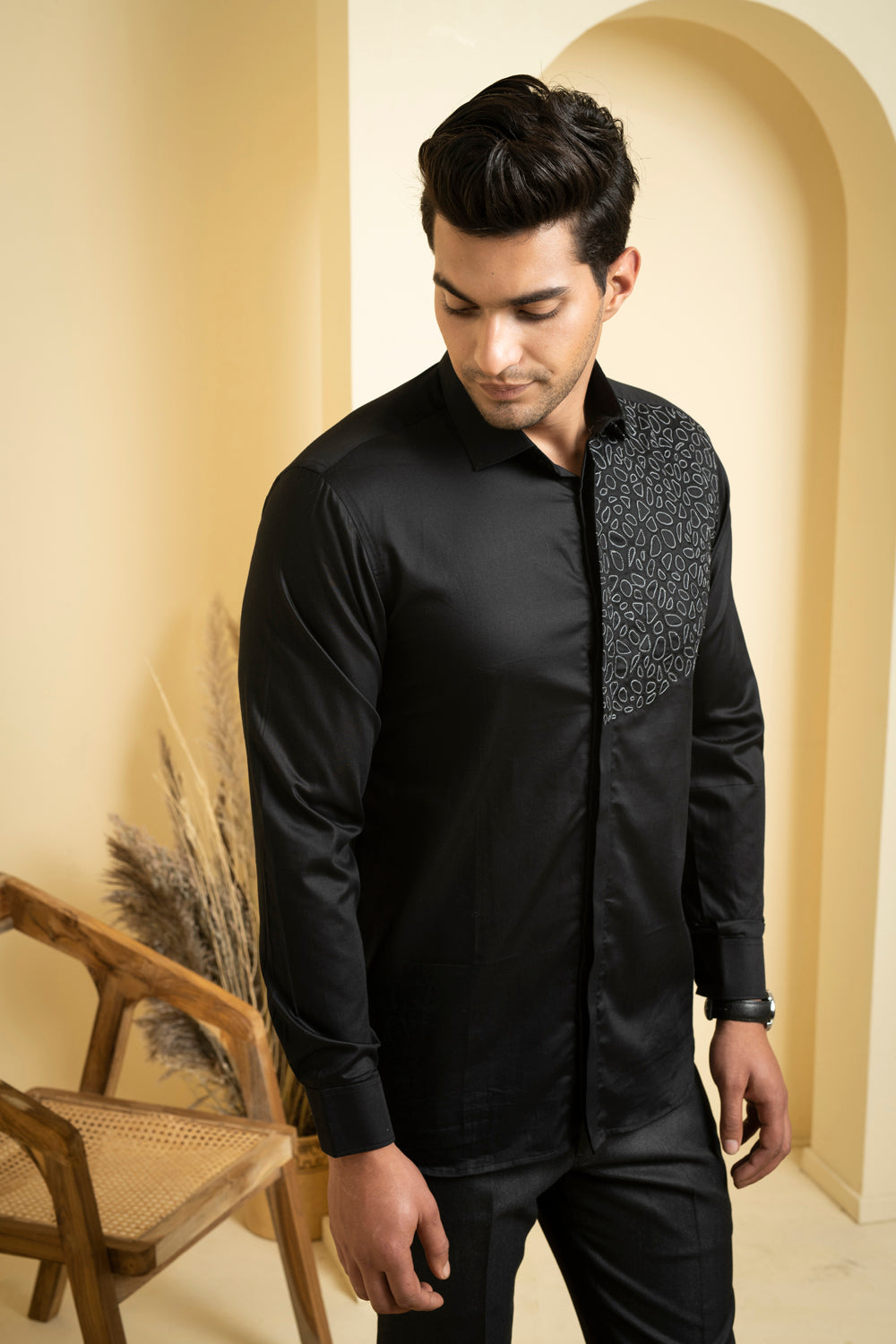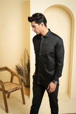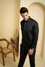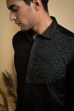 This black shirt is made of soft cotton satin and features unique abstract embroidery on the left shoulder. The intricate design adds a touch of artistic flair to the classic black shirt, making it perfect for both casual and formal occasions. The cotton satin fabric is breathable and comfortable to wear, making it a versatile addition to any wardrobe.
