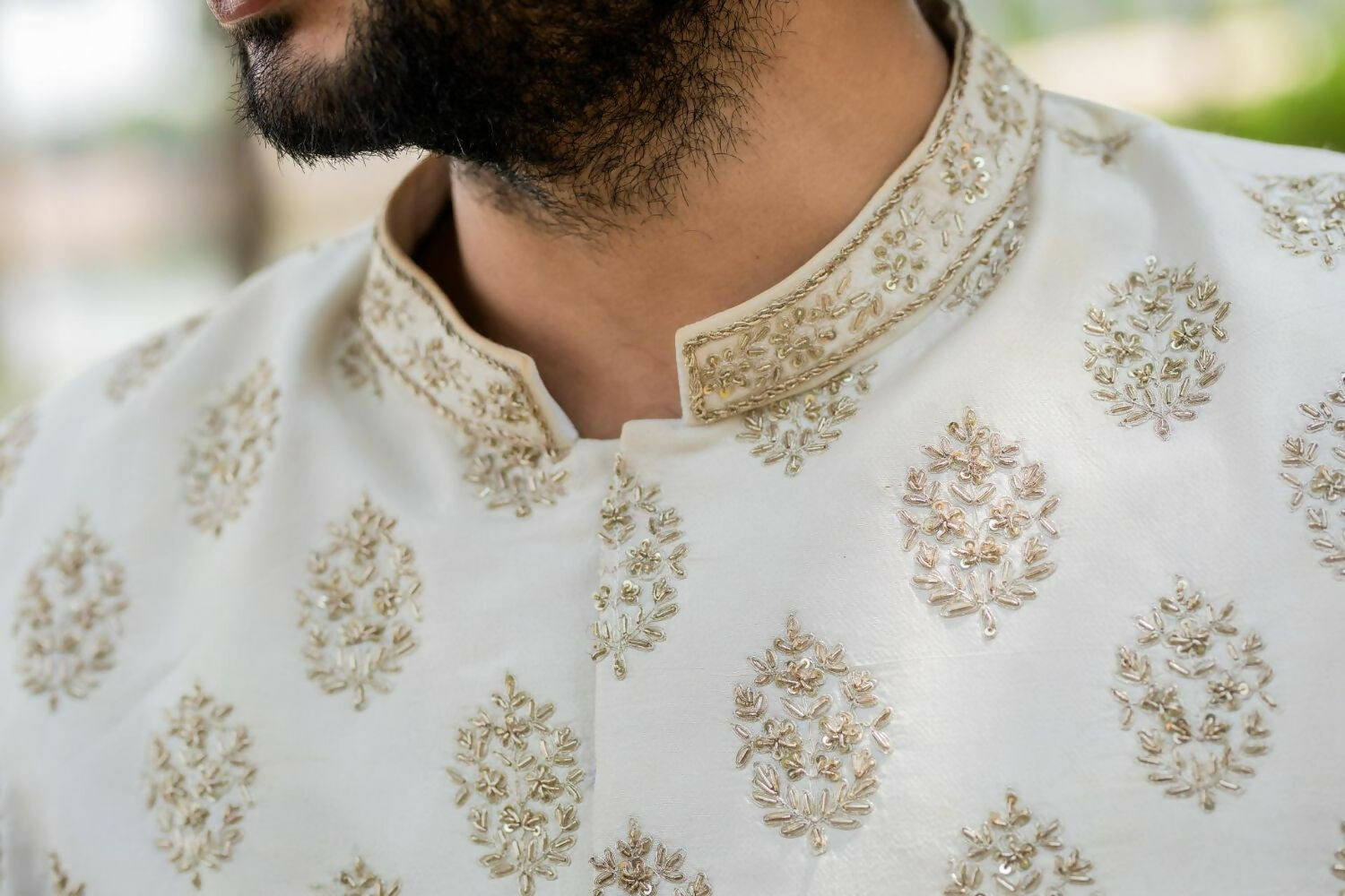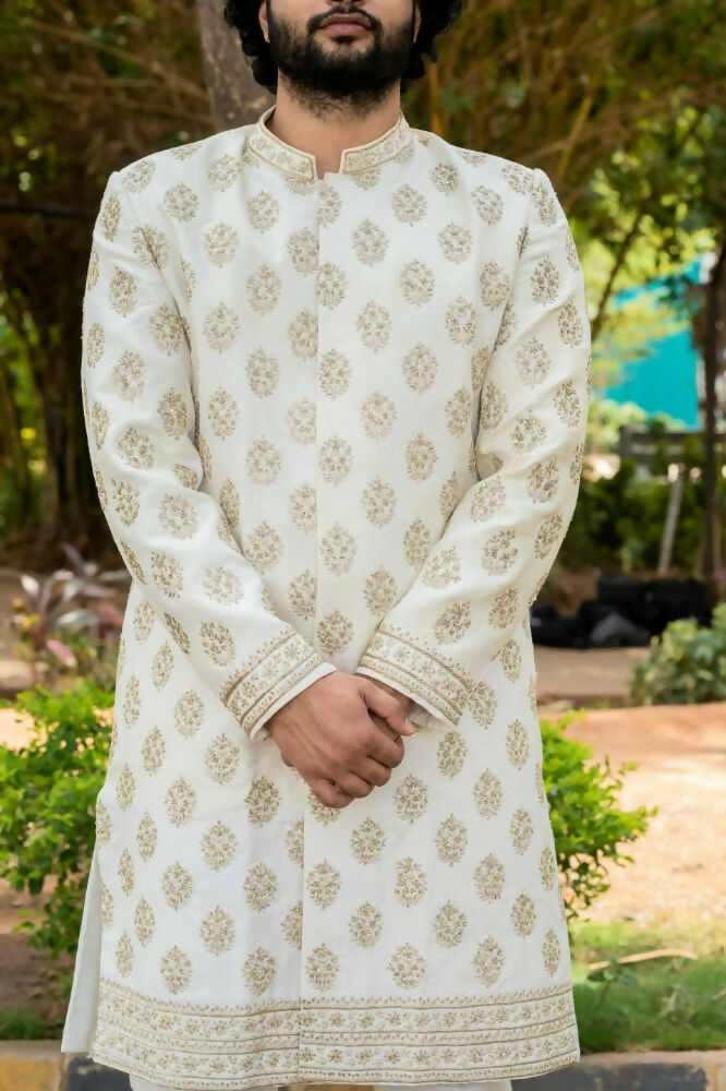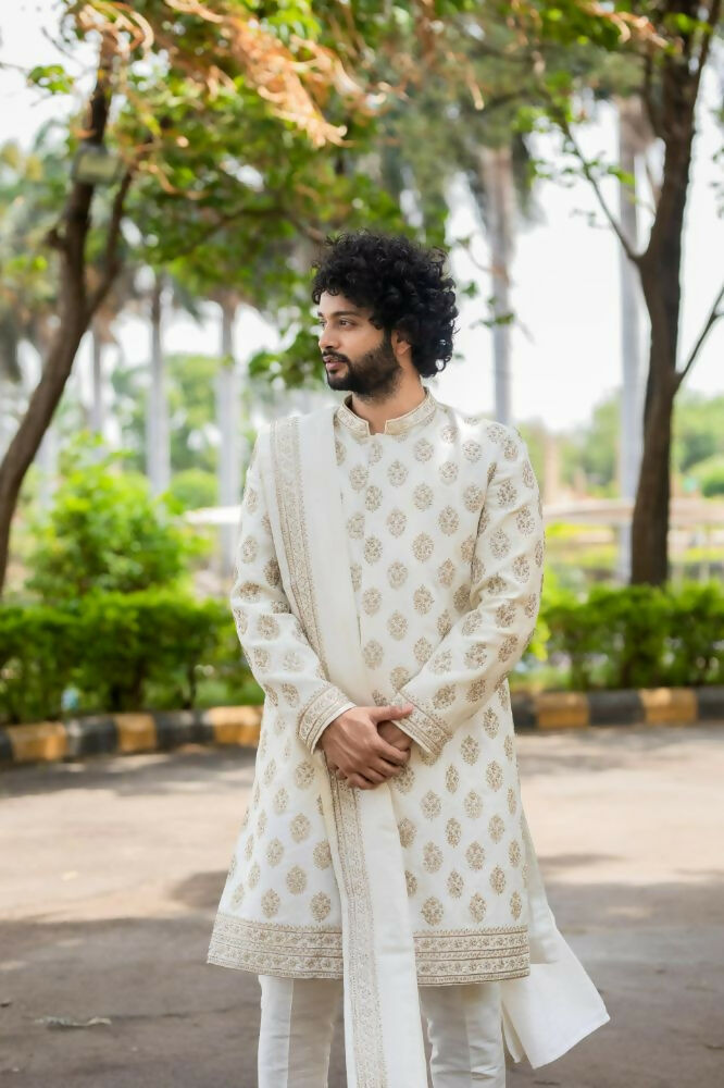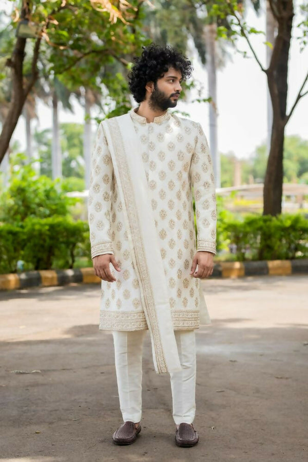 Featuring silver zardozi embroidered sherwani in dupion silk with all over motifs and heavy bordered design in the front of the body as well as on the sleeves. this has a dupatta with bordered hand embroidery work throughout. The pants are made of raw silk.