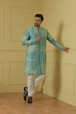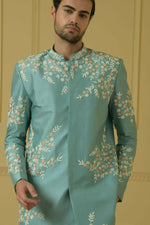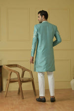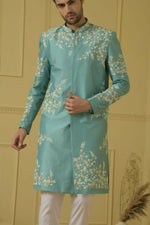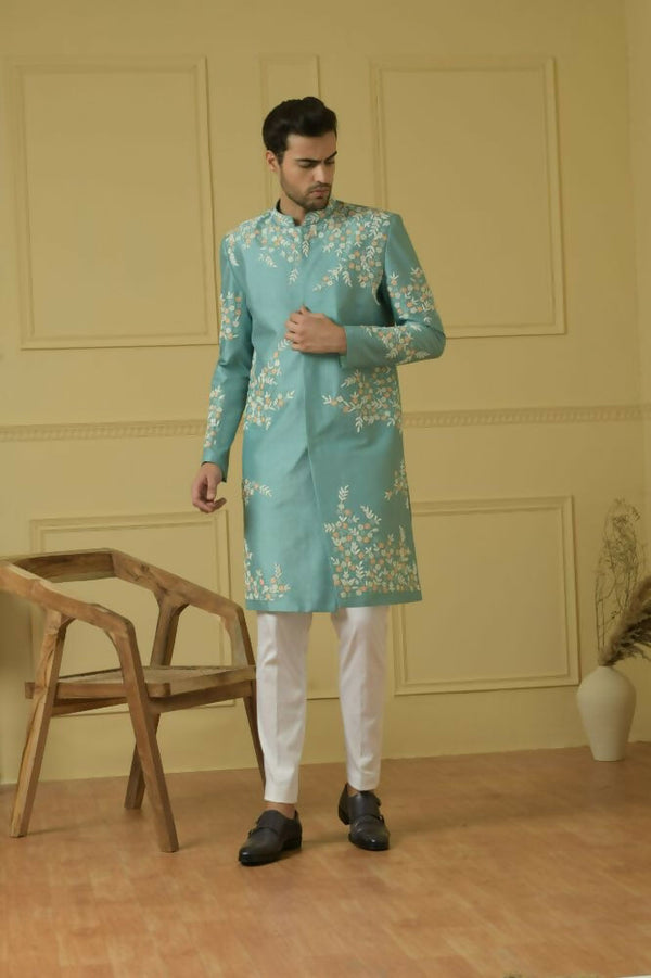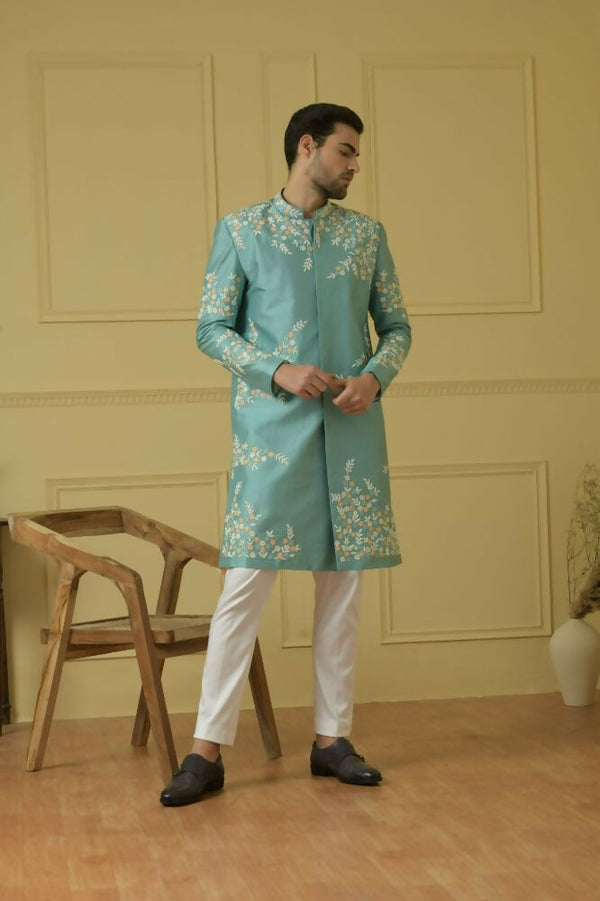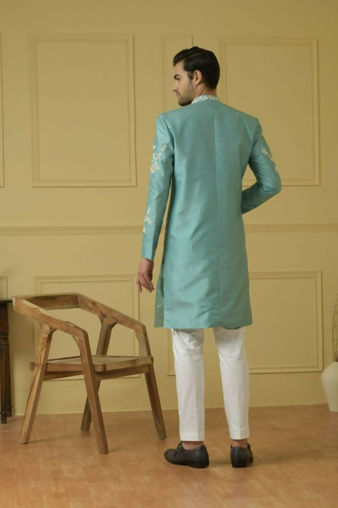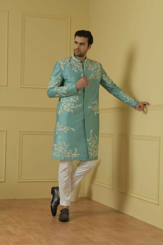 Sea blue sherwani with multi-colored hand embroidery made of dupion silk. Features peach, white, and sea green cut beads. Custom-made and tailored based on body measurements for a royal and luxurious feel with utmost comfort.