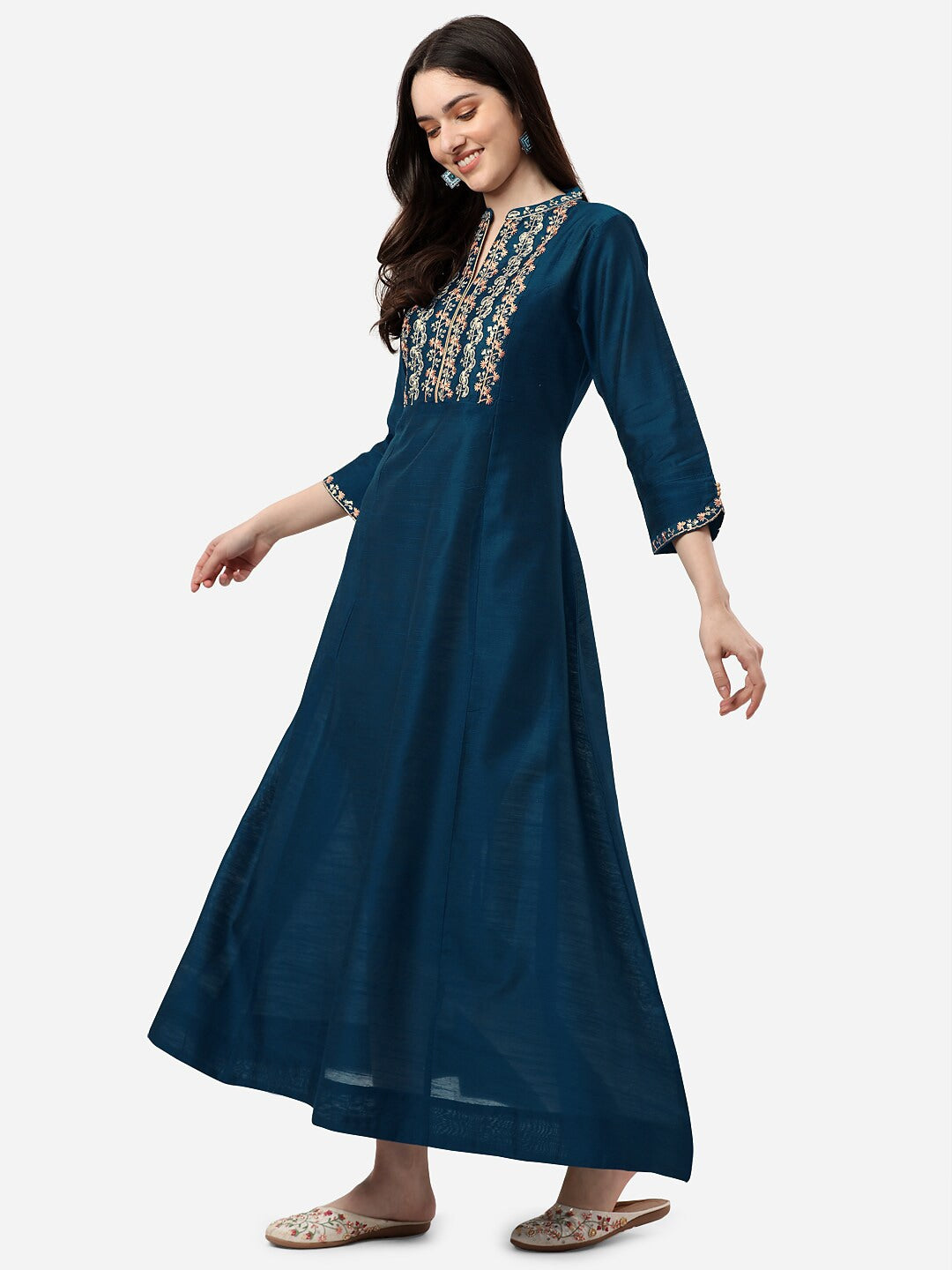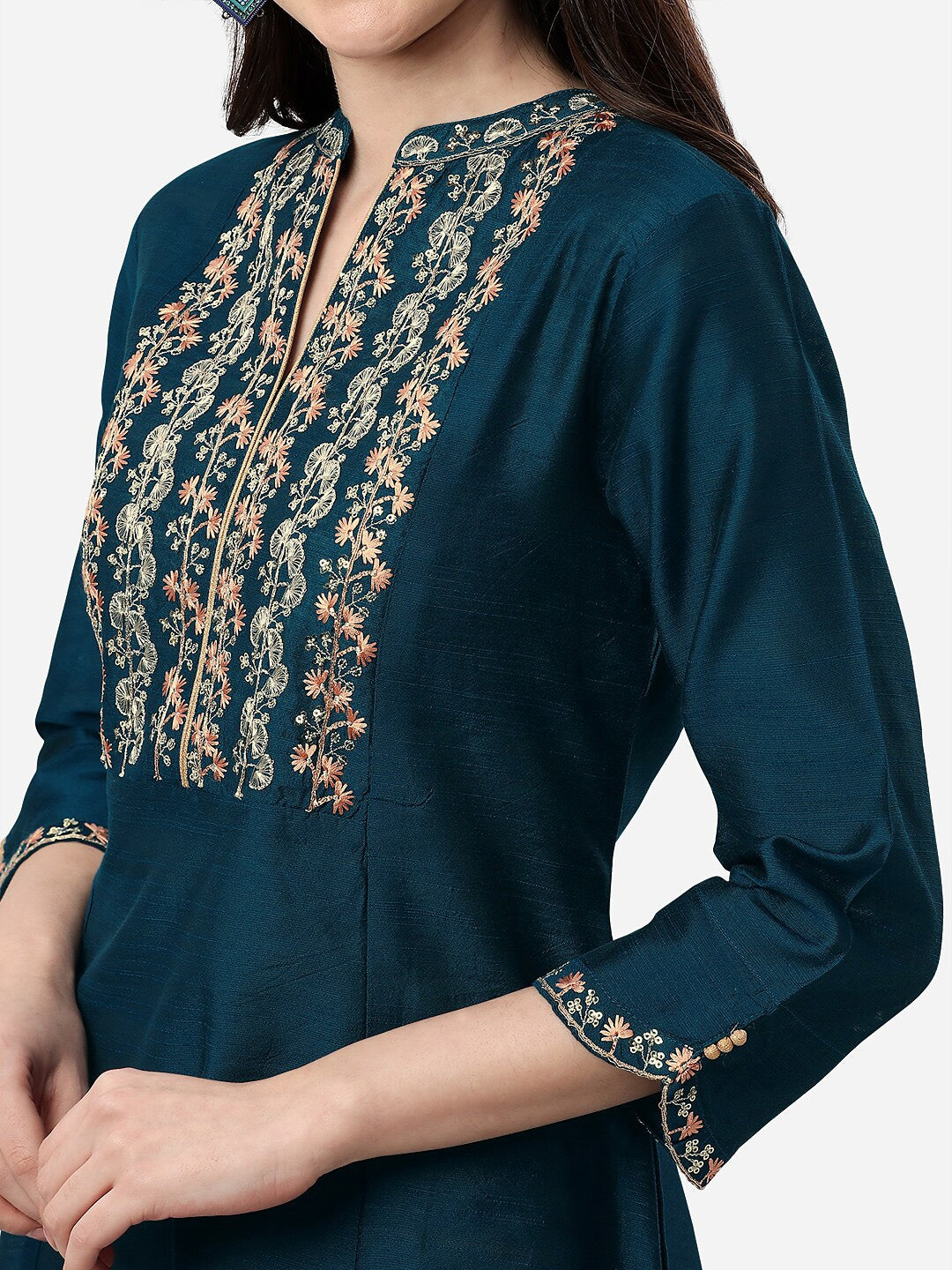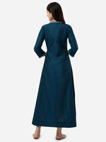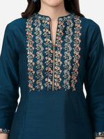 HERE&NOW Mandarin Collar Floral Embroidered A-Line Regular Fit Silk Kurta Product Details Colour: teal and gold-toned Floral embroidered Ma...