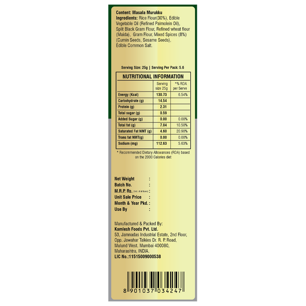 Rice Flour(30%), Edible vegetable oil (Refined Palmolein Oil) , Split Black Gram Flour, Refined wheat flour (Maida), Gram Flour, Mixed Spices (8%)(Cumin Seeds, Sesame Seeds) ,Edible Common Salt.