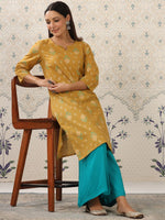 Ode by House of Pataudi Mustard Yellow & Teal Printed Pure Cotton Kurta with Palazzos Product Details Mustard yellow & teal blue printed...