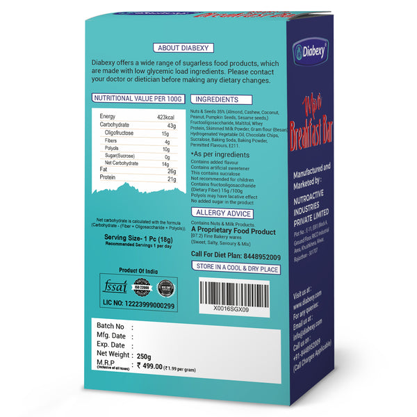 Diabexy Mini Breakfast Bar Ingredients: Almond, Whey Protein, Skimmed Milk Powder, Besan(Gram Flour), Kaju(Cashews), Coconut, Peanut, Pumpkin Seed...