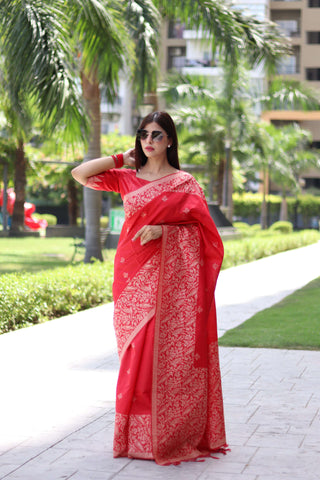 Jyoti Fashion Women's Red Handloom Raw Silk Weaving Pallu Traditional Saree with Blouse