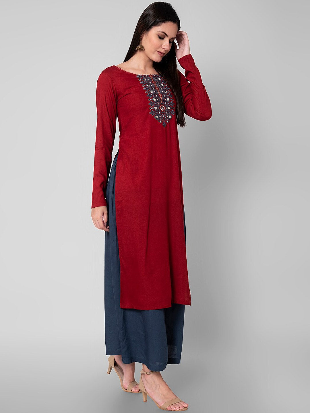 Kalini Women Maroon & blue Ethnic Motifs Embroidered Mirror Work Kurta with Palazzos Product Details Maroon embroidered Kurta with Palazzos ...