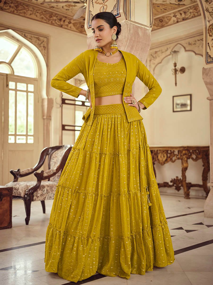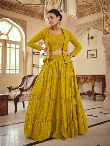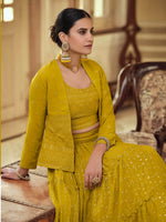 Mustard Yellow georgette Designer Suit features a Georgette blouse with georgette lehenga. Embroidery is completed with sequins and thread. this Style is made in India anc checked by hand to ensure high quality.
