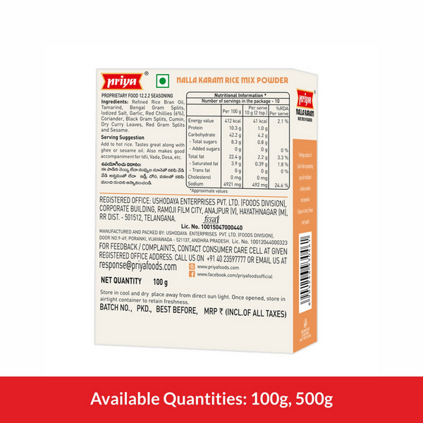 • Embellished with lavish spices and farm fresh ingredients, Priya Nalla Karam lets you relive the breakfast mood of the Delta. The hot-spicy powder is born out of the pungency of Guntur’s world-famous mirchis and processed with dexterity to make idlis and dosas truly special.