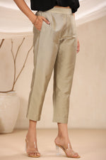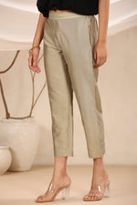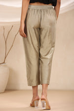 Beige solid silk slim-fit pants with an ankle-length hemline, designed for daily wear. These slip-on pants feature an elasticated waistband for comfort and include one pocket for added convenience. Ideal for a sleek and stylish look.