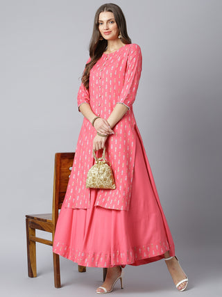 Khushal K Women Pink & White Printed Kurta with Solid Flared Maxi Skirt